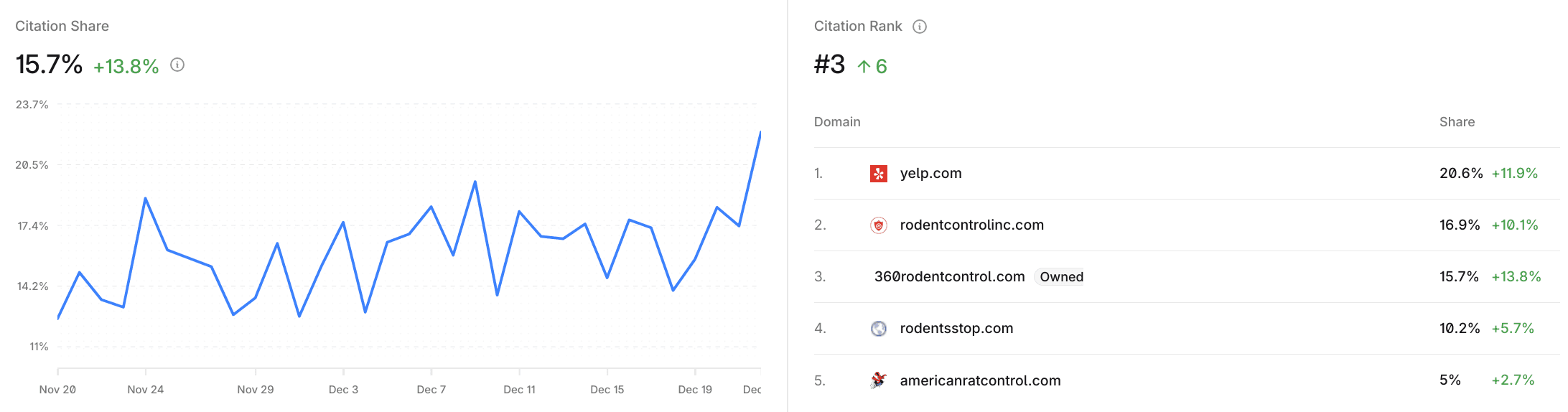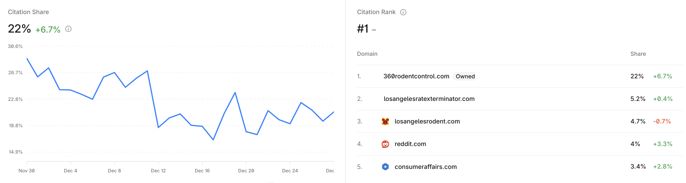 The biggest reward accrued within the citation share, as of the end of the tracking period, 360 Rodent Control is the most cited website on ChatGPT and #3 most cited on Google AI Overview