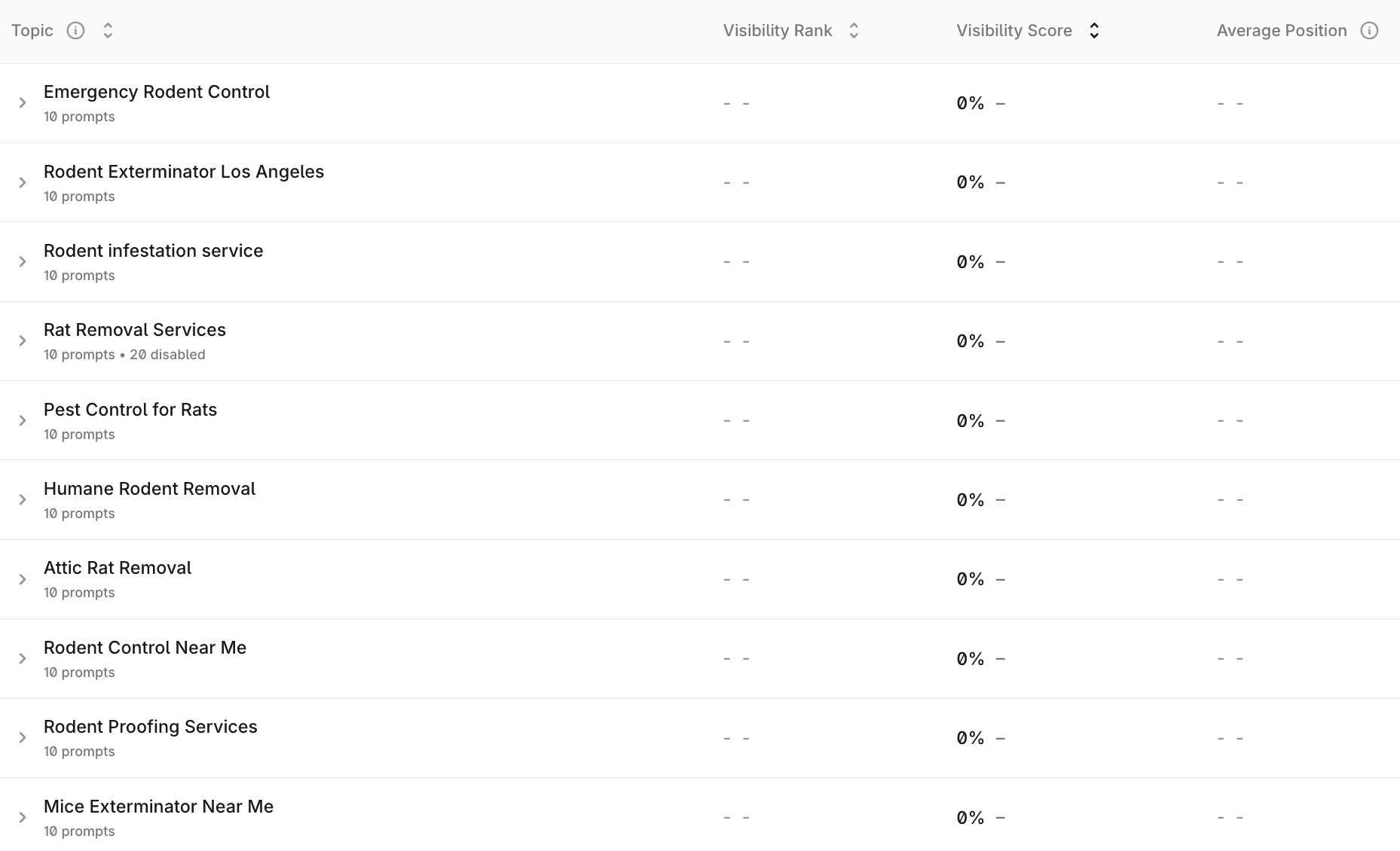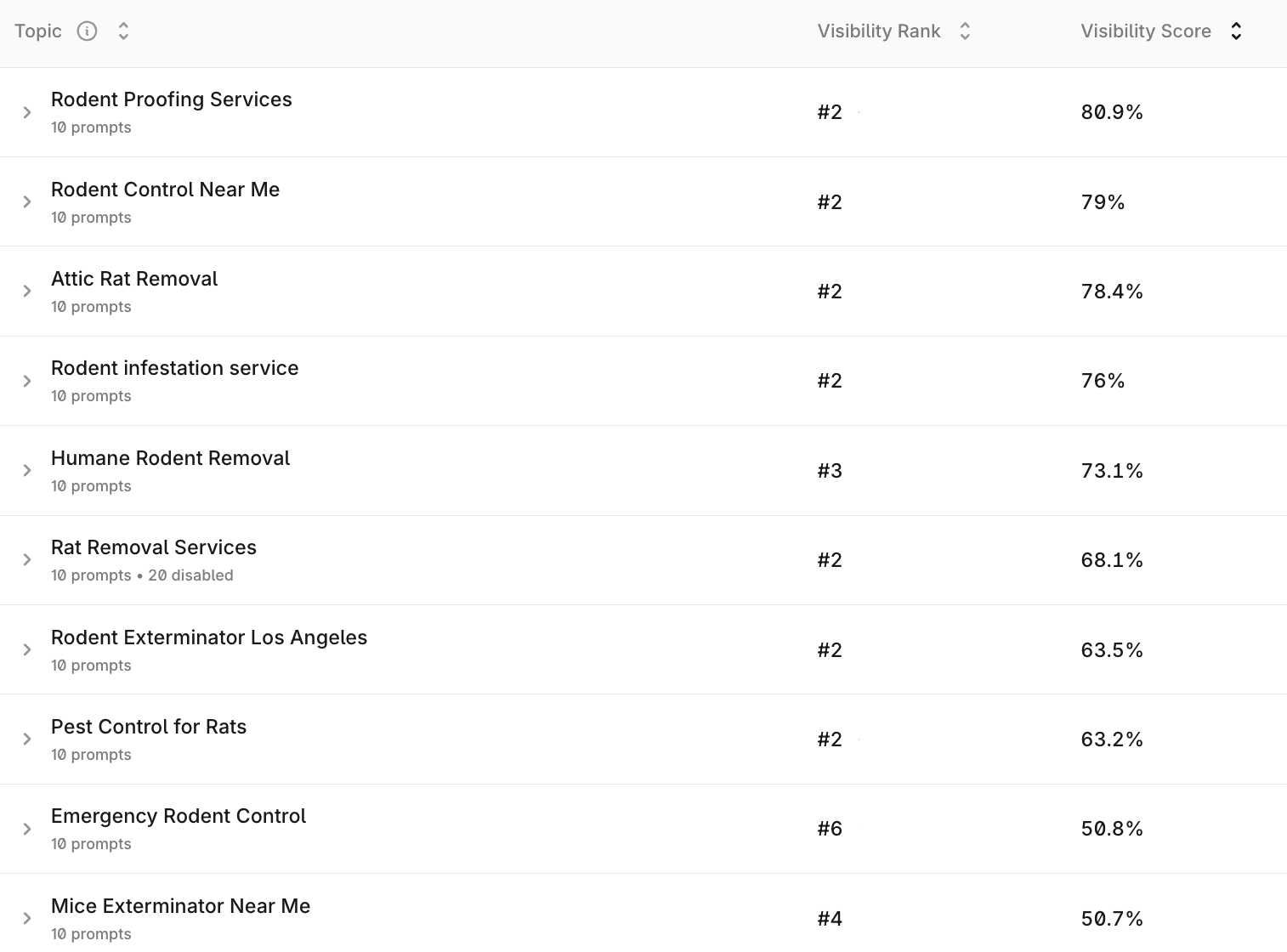 Monitor how AI engines answer the exact transactional and educational questions, not just keywords. This included consumer intent (urgent rodent problems) and commercial intent (facilities, restaurants, multi-site operators).