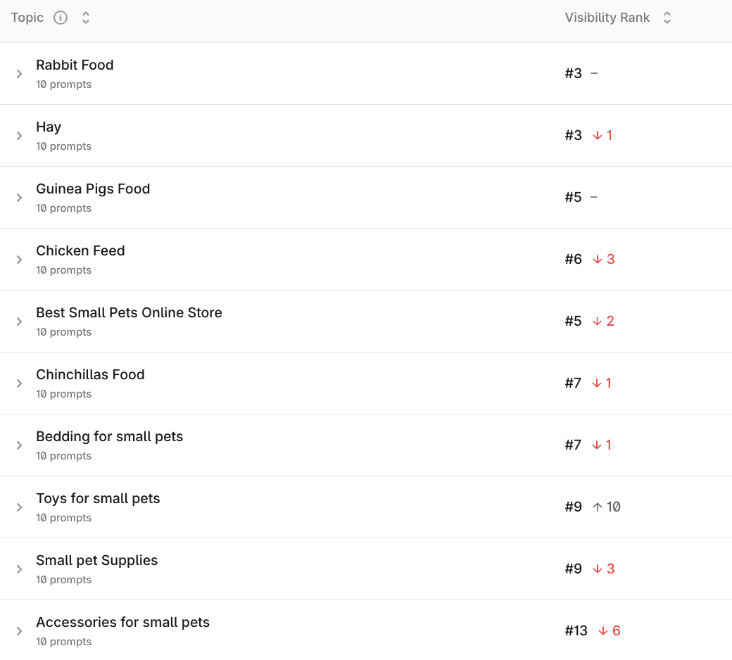 On December 1, 2025, Small Pet Select’s AI visibility was 50.6%, but they were ranking low across many high-intent topics. In practice, that meant they were not consistently being surfaced or cited when customers asked AI tools the exact questions that often precede a purchase decision.