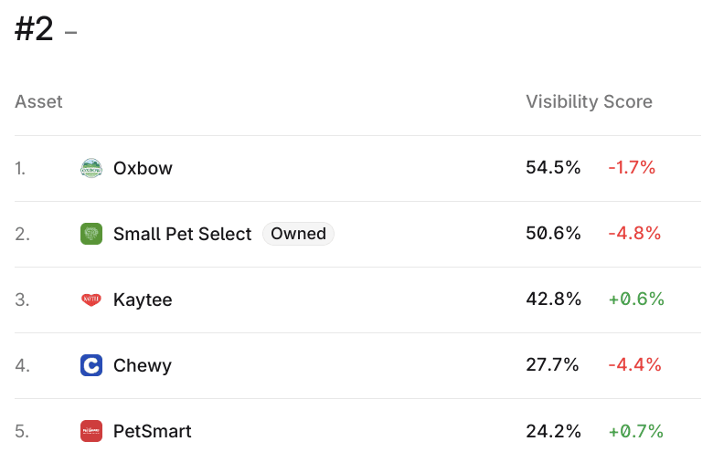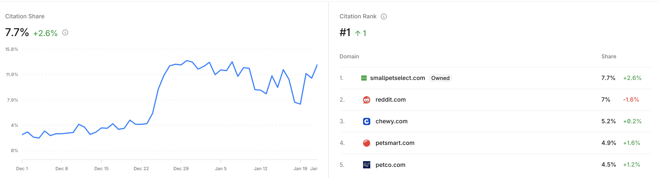 By adapting to how pet parents now research and choose products through AI, Small Pet Select moved from partial visibility to category leadership, earning the #1 citation spot and #1 visibility across chosen categories, turning AI discovery into meaningful commercial momentum.